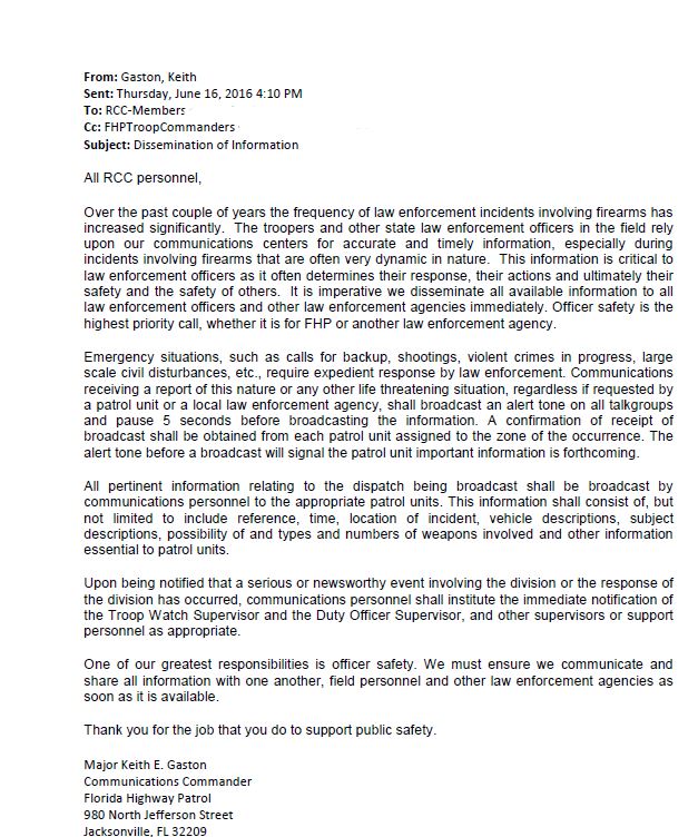 "It is imperative we disseminate all available information to all law enforcement officers and other law enforcement agencies immediately," FHP Communications Commander Keith E. Gaston wrote in an email to his staff four days after the Pulse massacre. "Emergency situations, such as calls for backup, shootings, violent crimes in progress, large scale civil disturbances, etc., require expedient response by law enforcement."